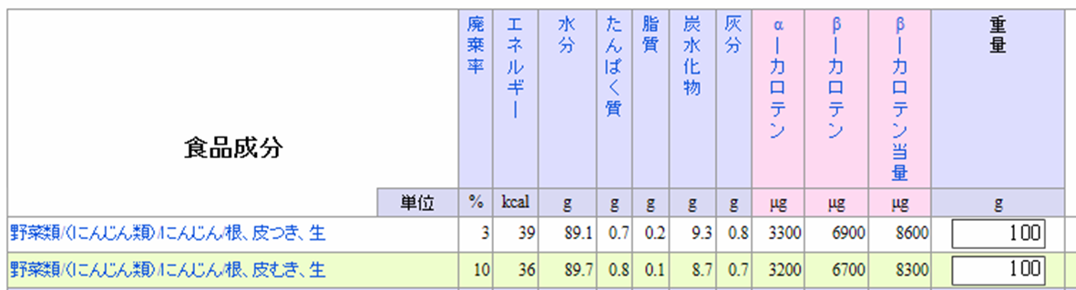 表からも分かるように皮を剥いたら多少差異はありますが、大幅な差はないように見えます。でも皮がついている方がカロテンが多いともいえます。